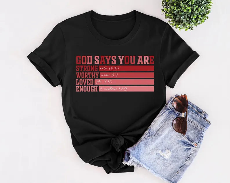 God Says You Are Strong Worthy Loved Enough Printed Shirt - Matching Unisex, Ladies Fitted & Kids | Faith-Based Shirt | Inspirational Christian T-Shirt