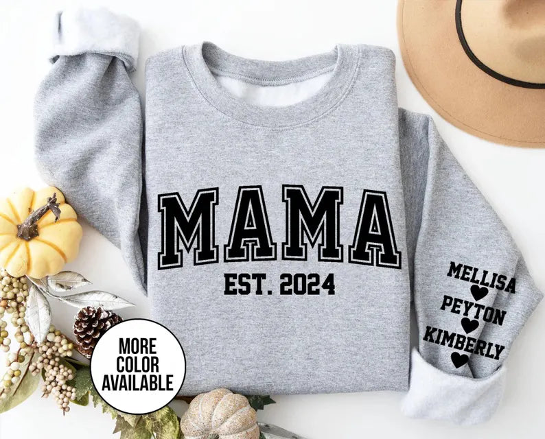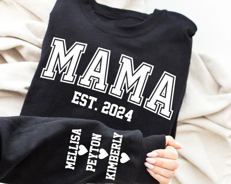 Mama Est Block Letters Children Names on Sleeve & Heart Unisex Mother's Day Printed Hoodie / Sweater