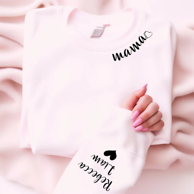 Mama on neckline Children Names on Sleeve & Heart Unisex Mother's Day Printed Hoodie / Sweater