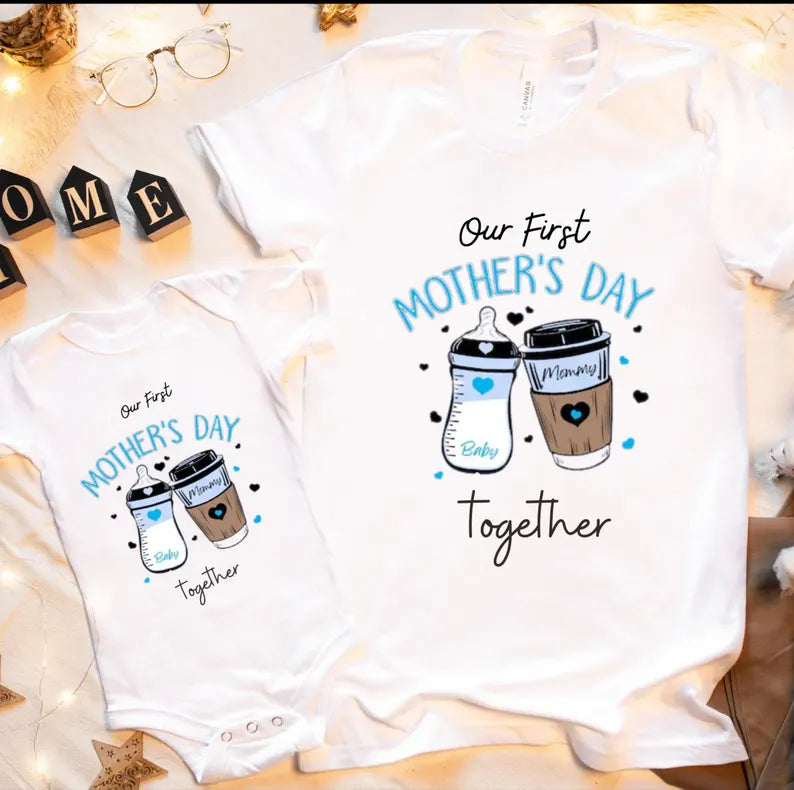 Our First Mothers day Bottle & Coffee (Pink or Blue) Matching Printed Shirts Mother's Day Shirts - Unisex, Ladies Fitted & Kids